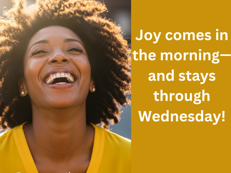 - A joyful Black woman laughing, colorful kente cloth accents, text: “Joy Comes in the Morning. Happy Wednesday.”